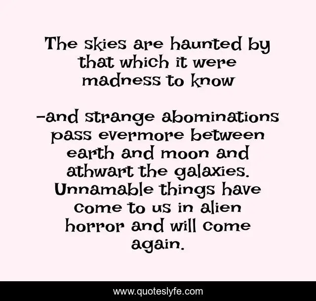 "and strange abominations pass evermore between earth and moon and athwart the galaxies. Unnamable things have come to us in alien horror and will come again. Quotes." Quoteslyfe.com, 2025. Sun. 07 Dec. 2025. <https://www.quoteslyfe.com/quote/The-skies-are-haunted-by-that-which-156207>.