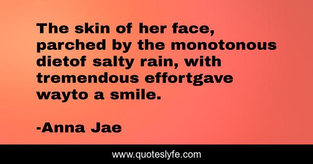 This page presents the quote "The skin of her face, parched by the monotonous dietof salty rain, with tremendous effortgave wayto a smile.". Author of this quote is Anna Jae. This quote is about smile, hope, happiness,.