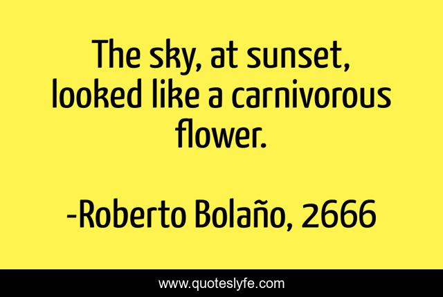 This page presents the quote "The sky, at sunset, looked like a carnivorous flower.". Author of this quote is Roberto Bolaño, 2666. This quote is about 129, sky, sunset,.