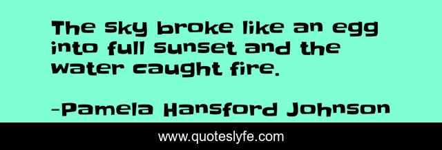 This page presents the quote "The sky broke like an egg into full sunset and the water caught fire.". Author of this quote is Pamela Hansford Johnson. This quote is about water, sunset, sky,.