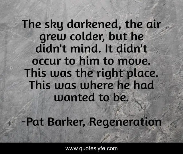 This page presents the quote "The sky darkened, the air grew colder, but he didn't mind. It didn't occur to him to move. This was the right place. This was where he had wanted to be.". Author of this quote is Pat Barker, Regeneration. This quote is about satisfaction, war,.