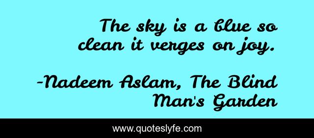 This page presents the quote "The sky is a blue so clean it verges on joy.". Author of this quote is Nadeem Aslam, The Blind Man's Garden. This quote is about joy, sky-blue,.