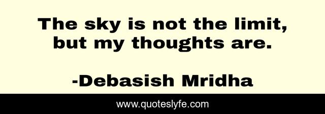 This page presents the quote "The sky is not the limit, but my thoughts are.". Author of this quote is Debasish Mridha. This quote is about debasish, mridha, philosophy, debasish-mridha, sky-is-not-the-limit, thoughts-are-my-limit,.