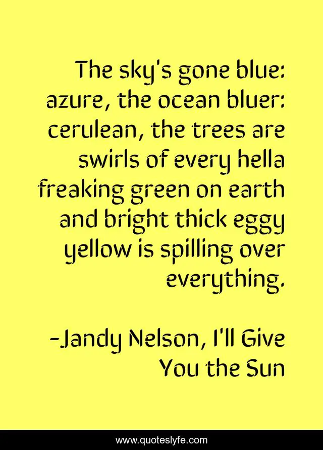 "Jandy Nelson, I'll Give You the Sun Quotes." Quoteslyfe.com, 2025. Sat. 06 Dec. 2025. <https://www.quoteslyfe.com/quote/The-sky-s-gone-blue-azure-the-72861>.