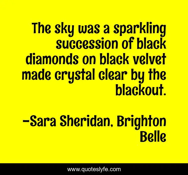 This page presents the quote "The sky was a sparkling succession of black diamonds on black velvet made crystal clear by the blackout.". Author of this quote is Sara Sheridan, Brighton Belle. This quote is about velvet, sky, wartime, stars, diamonds, blackout,.