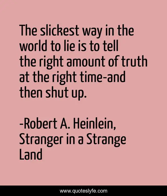 This page presents the quote "The slickest way in the world to lie is to tell the right amount of truth at the right time-and then shut up.". Author of this quote is Robert A. Heinlein, Stranger in a Strange Land. This quote is about sins-of-omission, lying,.