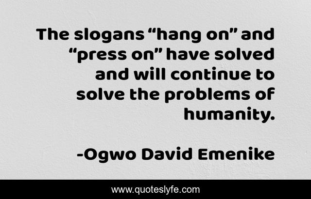 This page presents the quote "The slogans “hang on” and “press on” have solved and will continue to solve the problems of humanity.". Author of this quote is Ogwo David Emenike. This quote is about confidence, positive, motivational, optimistic, inspirational, enthusiasm, persistence,.