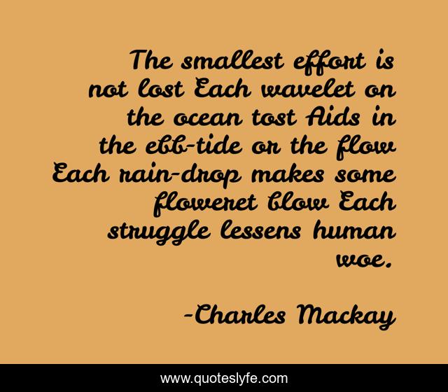 This page presents the quote "The smallest effort is not lost Each wavelet on the ocean tost Aids in the ebb-tide or the flow Each rain-drop makes some floweret blow Each struggle lessens human woe.". Author of this quote is Charles Mackay. .