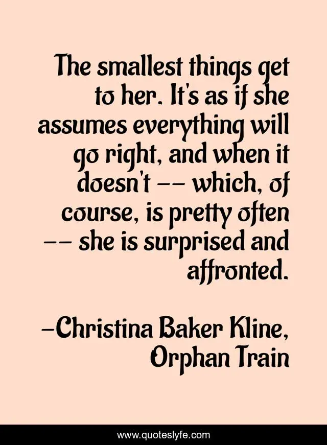 This page presents the quote "The smallest things get to her. It's as if she assumes everything will go right, and when it doesn't -- which, of course, is pretty often -- she is surprised and affronted.". Author of this quote is Christina Baker Kline, Orphan Train. .