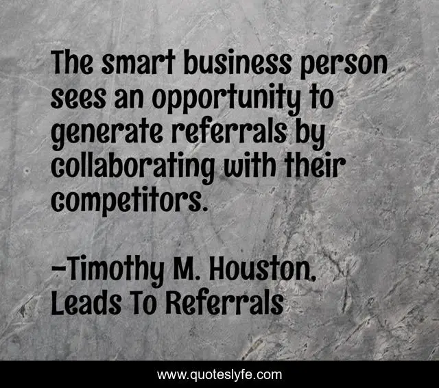 This page presents the quote "The smart business person sees an opportunity to generate referrals by collaborating with their competitors.". Author of this quote is Timothy M. Houston, Leads To Referrals. This quote is about marketing-advice, referrals, sales-training, marketing, sales, competition, competitors,.