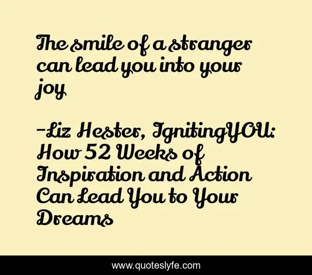 "Liz Hester, IgnitingYOU: How 52 Weeks of Inspiration and Action Can Lead You to Your Dreams Quotes." Quoteslyfe.com, 2025. Mon. 08 Dec. 2025. <https://www.quoteslyfe.com/quote/The-smile-of-a-stranger-can-lead-131260>.