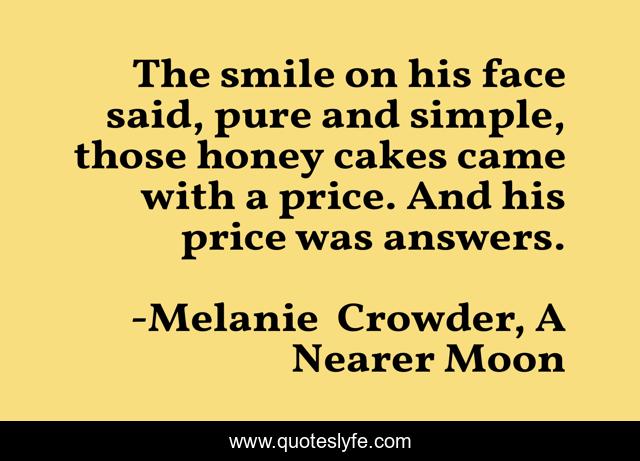 This page presents the quote "The smile on his face said, pure and simple, those honey cakes came with a price. And his price was answers.". Author of this quote is Melanie Crowder, A Nearer Moon. This quote is about sweets, food, friendship, kidlit, smile, price-tag, fantasy, happiness,.