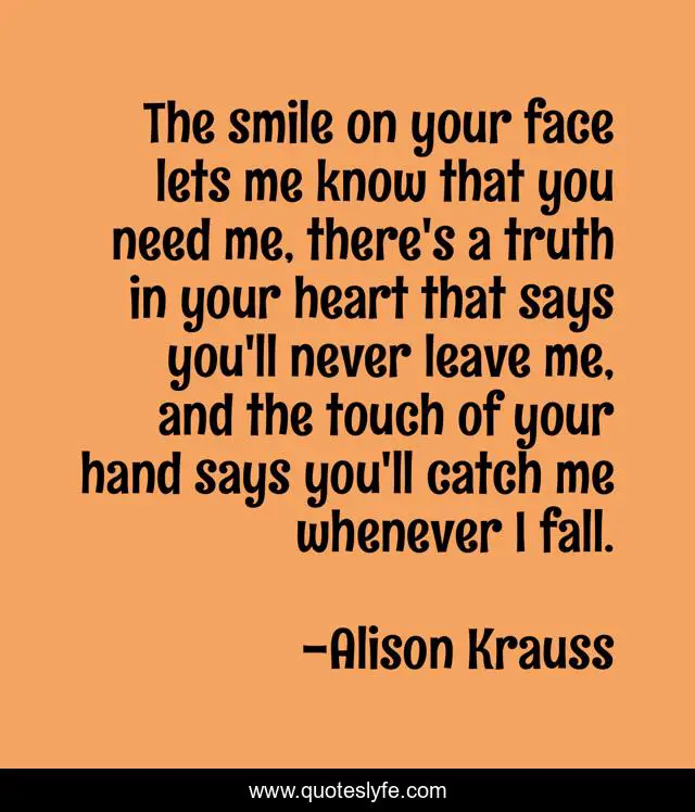 This page presents the quote "The smile on your face lets me know that you need me, there's a truth in your heart that says you'll never leave me, and the touch of your hand says you'll catch me whenever I fall.". Author of this quote is Alison Krauss. This quote is about heart, truth, fall,.
