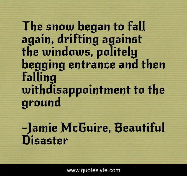 This page presents the quote "The snow began to fall again, drifting against the windows, politely begging entrance and then falling withdisappointment to the ground". Author of this quote is Jamie McGuire, Beautiful Disaster. This quote is about begging, disappointment, snow,.