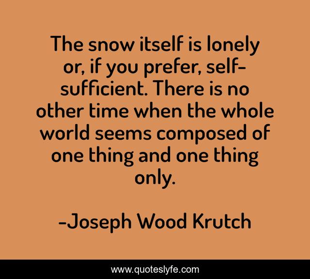 This page presents the quote "The snow itself is lonely or, if you prefer, self-sufficient. There is no other time when the whole world seems composed of one thing and one thing only.". Author of this quote is Joseph Wood Krutch. This quote is about world, lonely, time,.