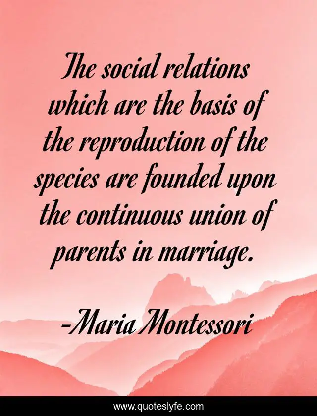 This page presents the quote "The social relations which are the basis of the reproduction of the species are founded upon the continuous union of parents in marriage.". Author of this quote is Maria Montessori. This quote is about parents, which, social,.