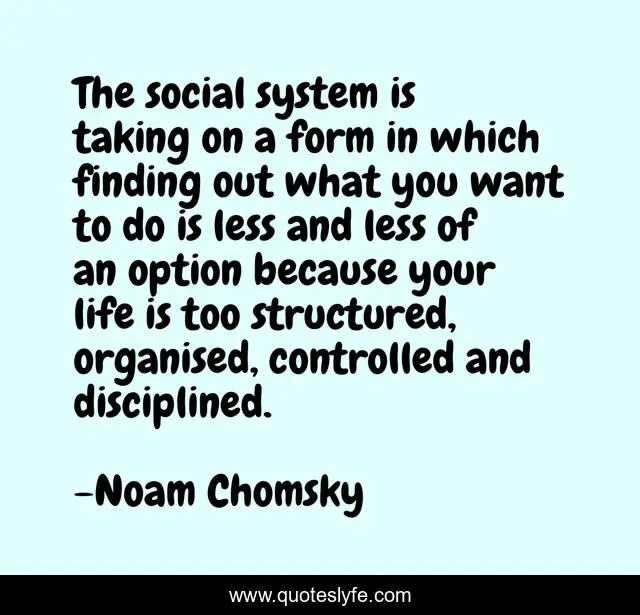 This page presents the quote "The social system is taking on a form in which finding out what you want to do is less and less of an option because your life is too structured, organised, controlled and disciplined.". Author of this quote is Noam Chomsky. This quote is about freedom, work, learning,.