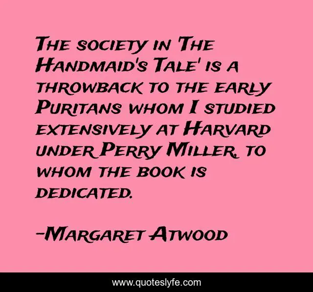 This page presents the quote "The society in 'The Handmaid's Tale' is a throwback to the early Puritans whom I studied extensively at Harvard under Perry Miller, to whom the book is dedicated.". Author of this quote is Margaret Atwood. This quote is about early, throwback, book,.