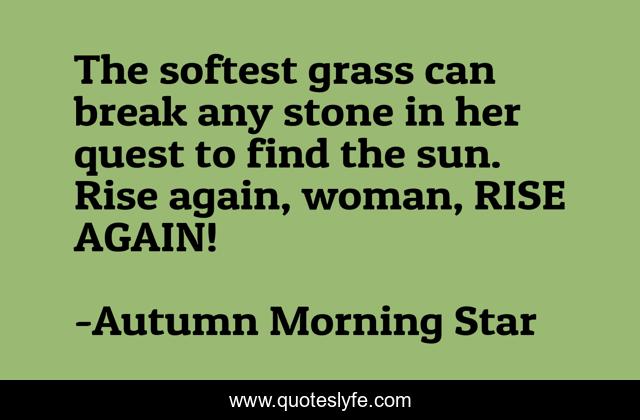 This page presents the quote "The softest grass can break any stone in her quest to find the sun. Rise again, woman, RISE AGAIN!". Author of this quote is Autumn Morning Star. This quote is about strength-and-courage, enthusiasm, woman, inspirational,.