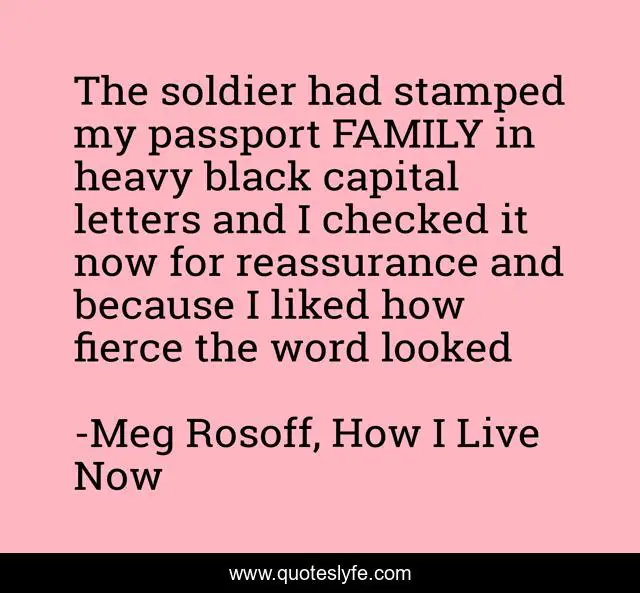 This page presents the quote "The soldier had stamped my passport FAMILY in heavy black capital letters and I checked it now for reassurance and because I liked how fierce the word looked". Author of this quote is Meg Rosoff, How I Live Now. .