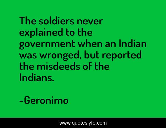 This page presents the quote "The soldiers never explained to the government when an Indian was wronged, but reported the misdeeds of the Indians.". Author of this quote is Geronimo. This quote is about soldiers, explained,.