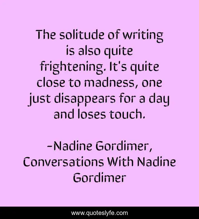 This page presents the quote "The solitude of writing is also quite frightening. It's quite close to madness, one just disappears for a day and loses touch.". Author of this quote is Nadine Gordimer, Conversations With Nadine Gordimer. This quote is about nadine-gordimer, solitude, writing,.