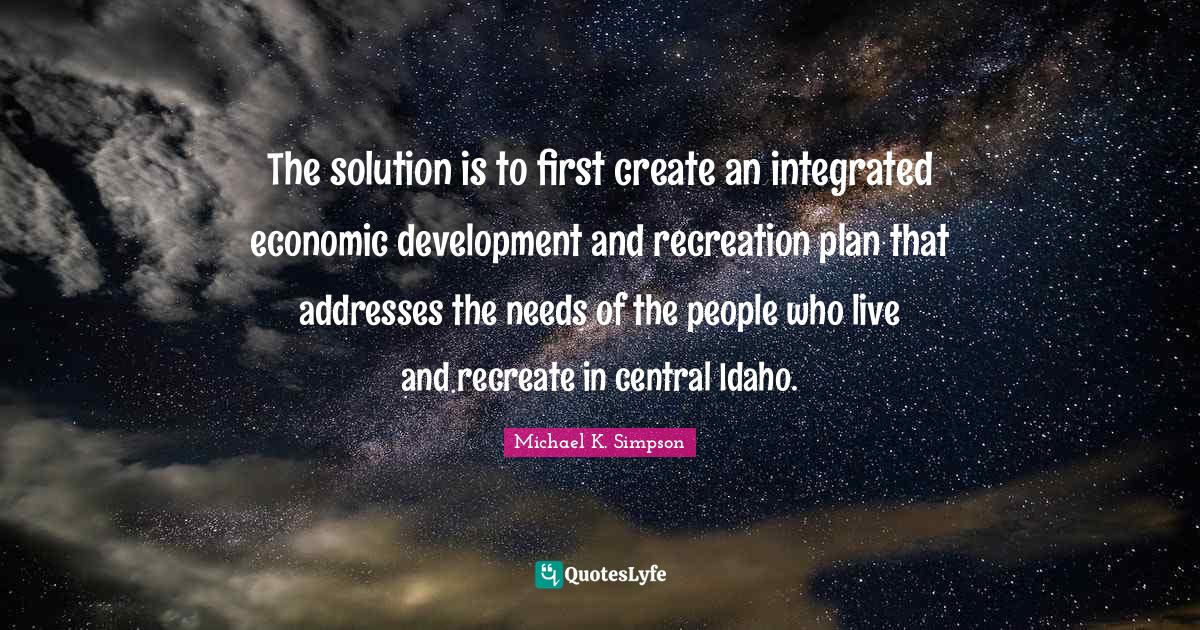 This page presents the quote "The solution is to first create an integrated economic development and recreation plan that addresses the needs of the people who live and recreate in central Idaho.". Author of this quote is Michael K. Simpson. This quote is about economic development, idaho, people, addresses, recreation, needs, integrated,.