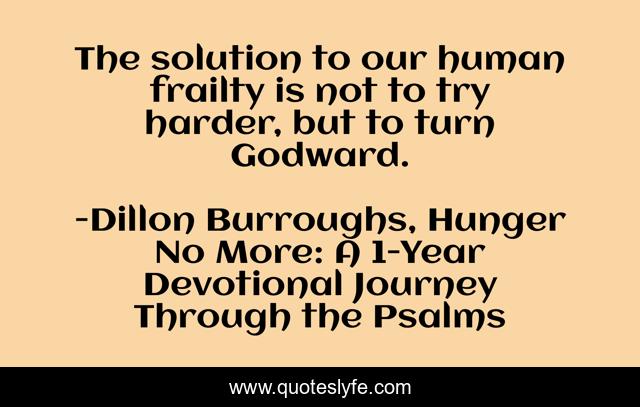 This page presents the quote "The solution to our human frailty is not to try harder, but to turn Godward.". Author of this quote is Dillon Burroughs, Hunger No More: A 1-Year Devotional Journey Through the Psalms. This quote is about frailty, god-s-will, worship,.