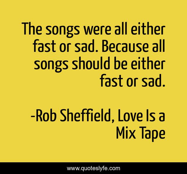 This page presents the quote "The songs were all either fast or sad. Because all songs should be either fast or sad.". Author of this quote is Rob Sheffield, Love Is a Mix Tape. This quote is about music, songs,.