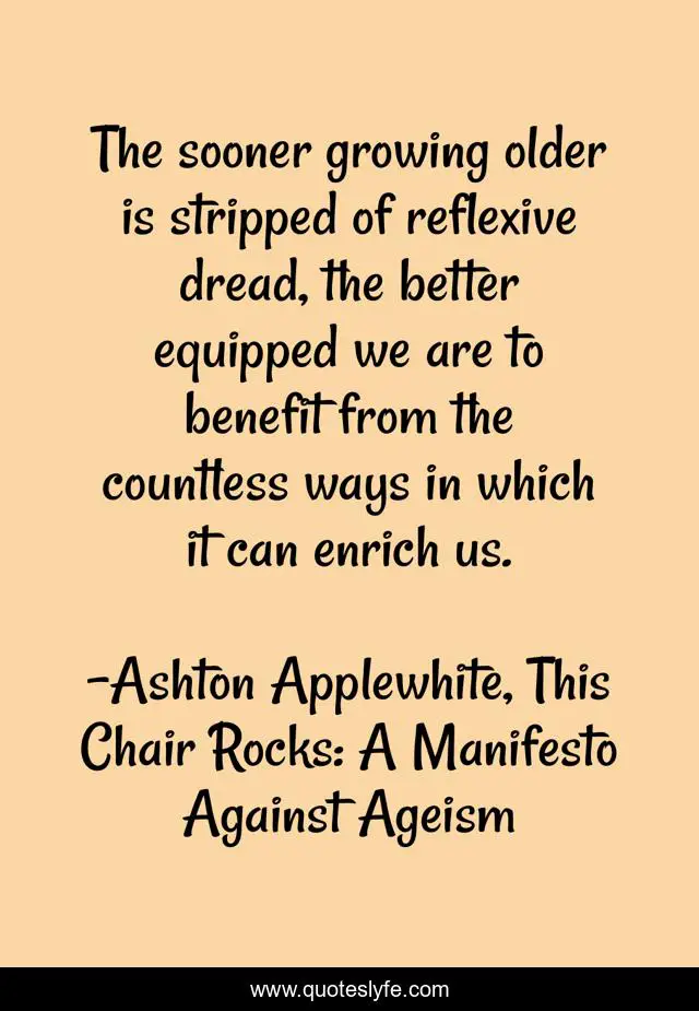 This page presents the quote "The sooner growing older is stripped of reflexive dread, the better equipped we are to benefit from the countless ways in which it can enrich us.". Author of this quote is Ashton Applewhite, This Chair Rocks: A Manifesto Against Ageism. This quote is about aging, wisedom, growing-old, wise, growing-older,.