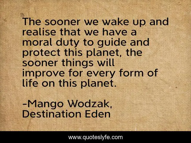 This page presents the quote "The sooner we wake up and realise that we have a moral duty to guide and protect this planet, the sooner things will improve for every form of life on this planet.". Author of this quote is Mango Wodzak, Destination Eden. This quote is about protect, protectiveness, life, awakening, responsibility, dominion, moral-duty, earth, guide,.