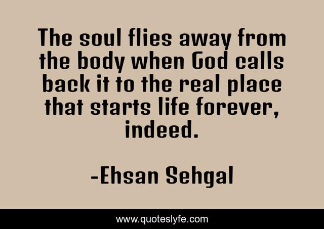 This page presents the quote "The soul flies away from the body when God calls back it to the real place that starts life forever, indeed.". Author of this quote is Ehsan Sehgal. .