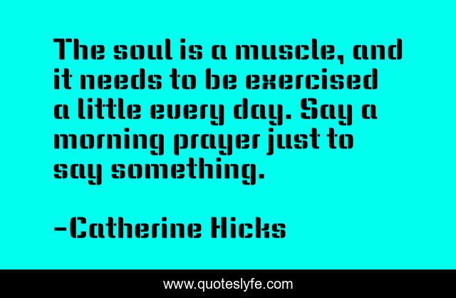 This page presents the quote "The soul is a muscle, and it needs to be exercised a little every day. Say a morning prayer just to say something.". Author of this quote is Catherine Hicks. This quote is about prayer, day, soul,.