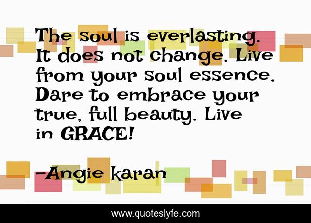This page presents the quote "The soul is everlasting. It does not change. Live from your soul essence. Dare to embrace your true, full beauty. Live in GRACE!". Author of this quote is Angie karan. This quote is about dare-to-embrace-your-true, full-beauty, live-from-your-soul-essence, beauty, soul-essence, angie-karan, soul, the-soul-is-everlasting, grace,.