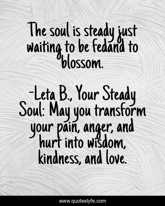 This page presents the quote "The soul is steady just waiting to be fedand to blossom.". Author of this quote is Leta B., Your Steady Soul: May you transform your pain, anger, and hurt into wisdom, kindness, and love.. This quote is about spirituality, intuition, soul,.