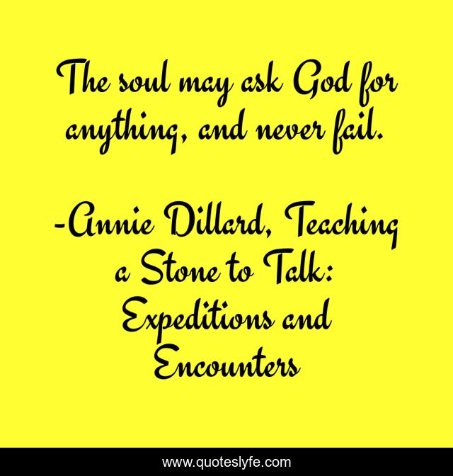 "Annie Dillard, Teaching a Stone to Talk: Expeditions and Encounters Quotes." Quoteslyfe.com, 2025. Sat. 06 Dec. 2025. <https://www.quoteslyfe.com/quote/The-soul-may-ask-God-for-anything-11262>.