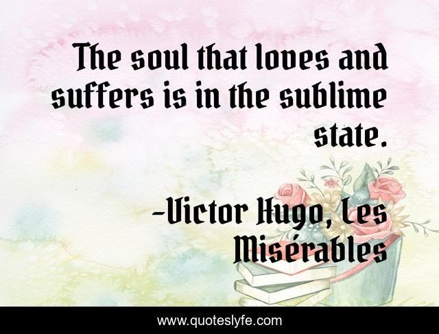 This page presents the quote "The soul that loves and suffers is in the sublime state.". Author of this quote is Victor Hugo, Les Misérables. This quote is about love, soul, suffering, sublime, pain, feeling, affection,.