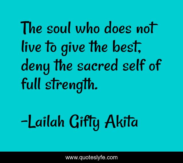 This page presents the quote "The soul who does not live to give the best, deny the sacred self of full strength.". Author of this quote is Lailah Gifty Akita. This quote is about strength, soul, wisdom-of-lailah-gifty-akita, inspirational, enthusiasm, giving-your-best,.
