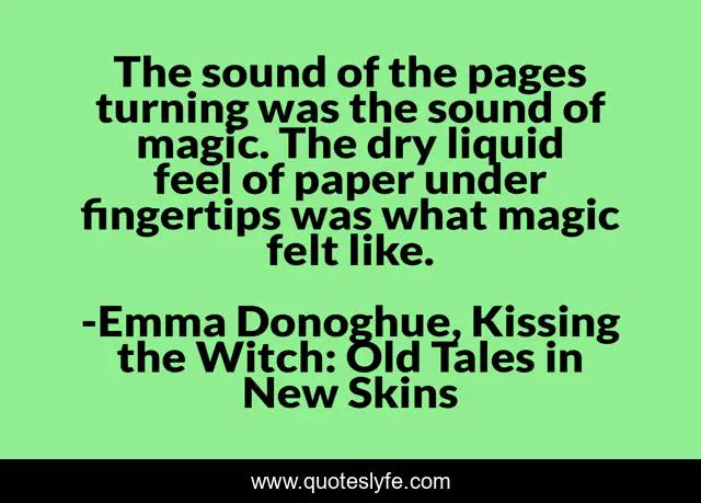 This page presents the quote "The sound of the pages turning was the sound of magic. The dry liquid feel of paper under fingertips was what magic felt like.". Author of this quote is Emma Donoghue, Kissing the Witch: Old Tales in New Skins. This quote is about fantasy, fairy-tale,.