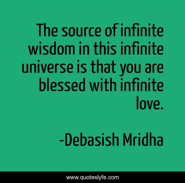 This page presents the quote "The source of infinite wisdom in this infinite universe is that you are blessed with infinite love.". Author of this quote is Debasish Mridha. This quote is about love, infinite-love, philosophy, debasish-mridha, wisdom, quotes, infinite-wisdom, debasish-mridha-md, inspirational,.
