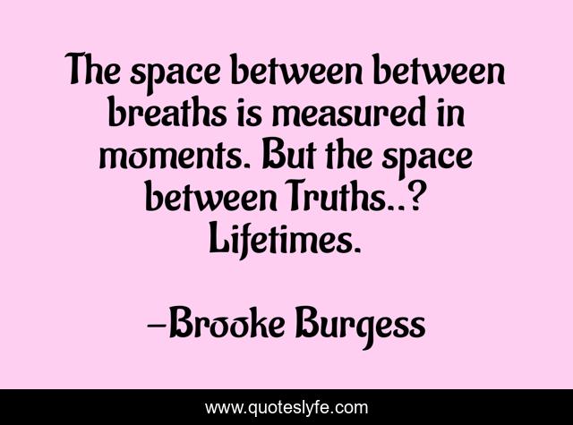This page presents the quote "The space between between breaths is measured in moments. But the space between Truths..? Lifetimes.". Author of this quote is Brooke Burgess. This quote is about breathing-in-awareness, inspirational, deep-thoughts, enthusiasm, meditation, truth-of-life,.