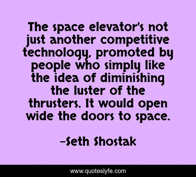 This page presents the quote "The space elevator's not just another competitive technology, promoted by people who simply like the idea of diminishing the luster of the thrusters. It would open wide the doors to space.". Author of this quote is Seth Shostak. This quote is about space, doors, people,.