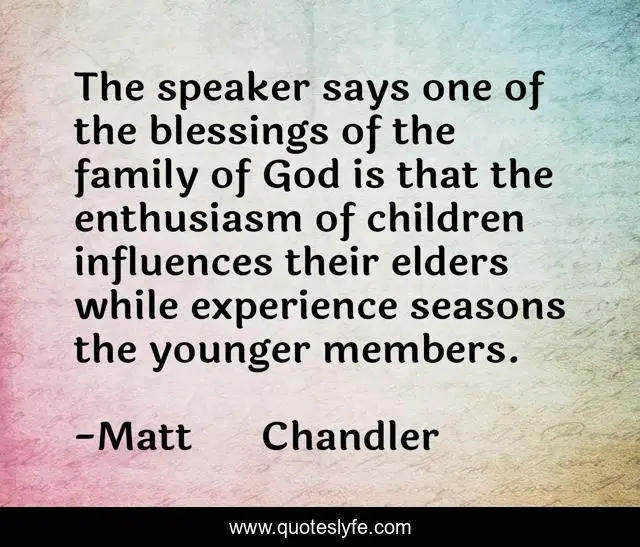 This page presents the quote "The speaker says one of the blessings of the family of God is that the enthusiasm of children influences their elders while experience seasons the younger members.". Author of this quote is Matt Chandler. This quote is about maturation, parenthood, discipleship, regeneration,.