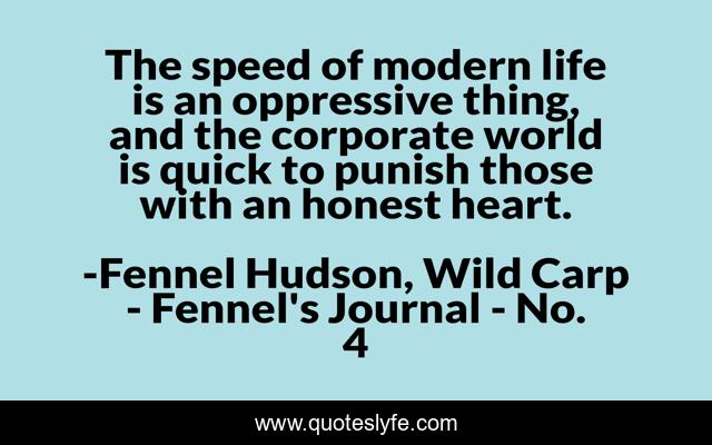This page presents the quote "The speed of modern life is an oppressive thing, and the corporate world is quick to punish those with an honest heart.". Author of this quote is Fennel Hudson, Wild Carp - Fennel's Journal - No. 4. This quote is about work-life-balance, pace-of-modern-life, stress, work, corporate-culture,.