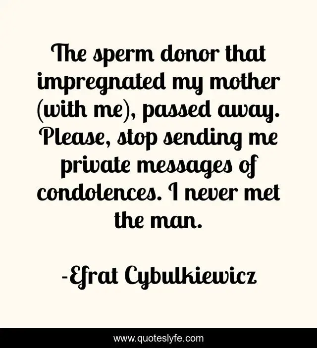 This page presents the quote "The sperm donor that impregnated my mother (with me), passed away. Please, stop sending me private messages of condolences. I never met the man.". Author of this quote is Efrat Cybulkiewicz. This quote is about death, condolences, passing-over, passed-away, let-it-be, impregnating, letting-go-of-the-past, mother, sperm-donor,.