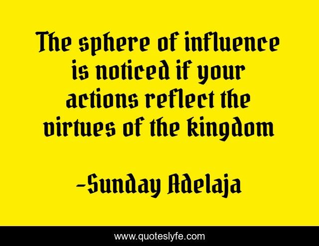 This page presents the quote "The sphere of influence is noticed if your actions reflect the virtues of the kingdom". Author of this quote is Sunday Adelaja. This quote is about kingdom, influence, virtues, actions, reflect, sphere,.