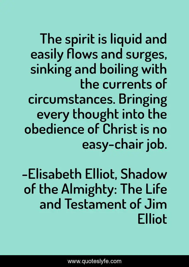 This page presents the quote "The spirit is liquid and easily flows and surges, sinking and boiling with the currents of circumstances. Bringing every thought into the obedience of Christ is no easy-chair job.". Author of this quote is Elisabeth Elliot, Shadow of the Almighty: The Life and Testament of Jim Elliot. .
