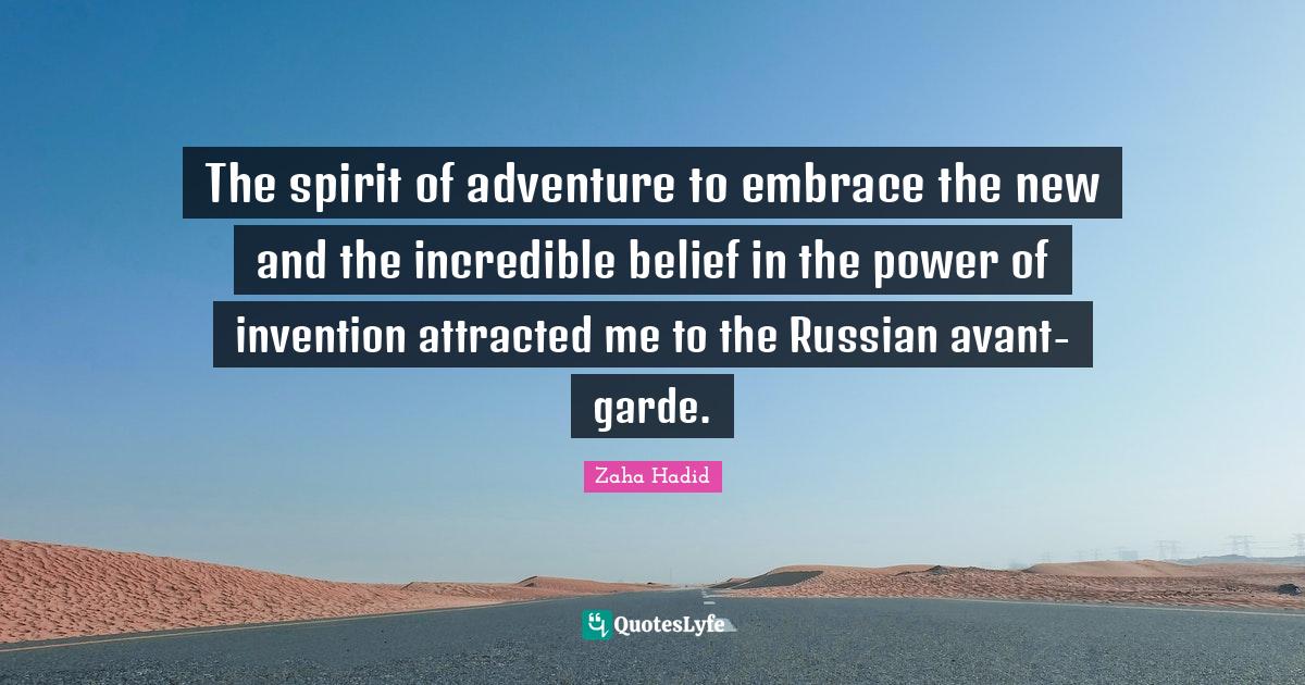 This page presents the quote "The spirit of adventure to embrace the new and the incredible belief in the power of invention attracted me to the Russian avant-garde.". Author of this quote is Zaha Hadid. This quote is about embrace, avant garde, belief, power, spirit, adventure, invention,.