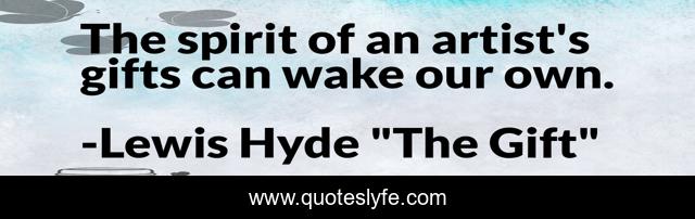 This page presents the quote "The spirit of an artist's gifts can wake our own.". Author of this quote is Lewis Hyde "The Gift". This quote is about talent, gift, artist, writer, creativity, imagination, awakening, spirit, inspiration,.