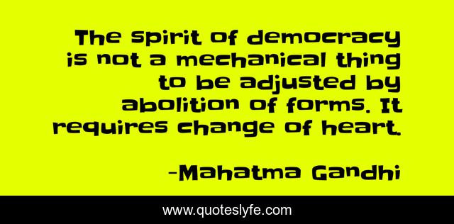 This page presents the quote "The spirit of democracy is not a mechanical thing to be adjusted by abolition of forms. It requires change of heart.". Author of this quote is Mahatma Gandhi. This quote is about heart, spirit, democracy,.